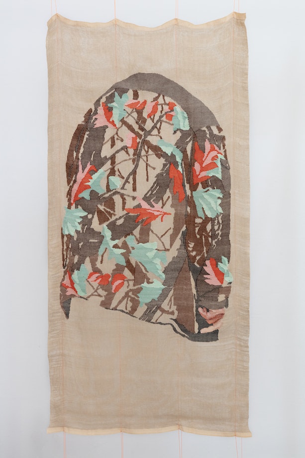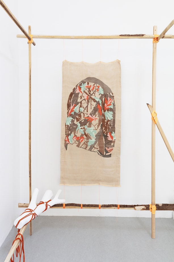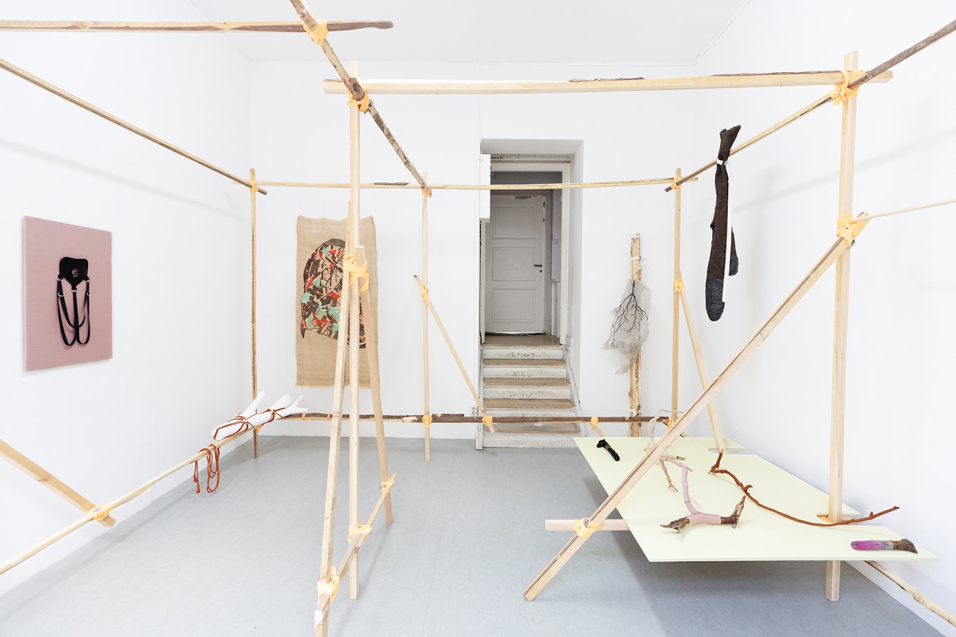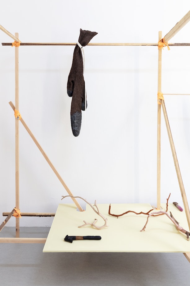 I installationen finns kroppar och material som trär sig på och tränger in i varandra. De tovas ihop. Extasen är materiell. Jag tänker mig att man rör sig med buken mot marken, krälande – eller som ett lager moss som belöper en stenhäll – . över andra kroppar, mänskliga eller ej, organiska eller ej. Becoming Nature.