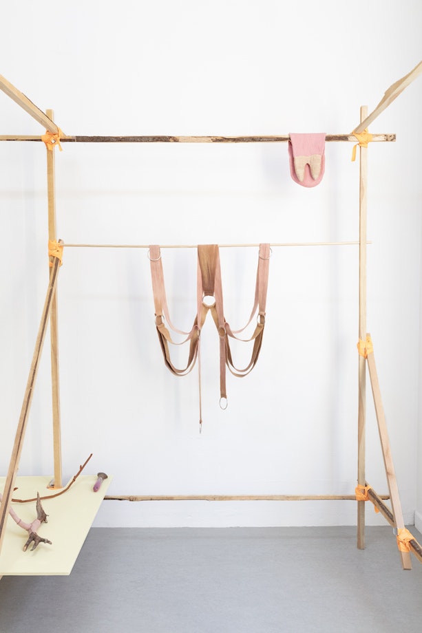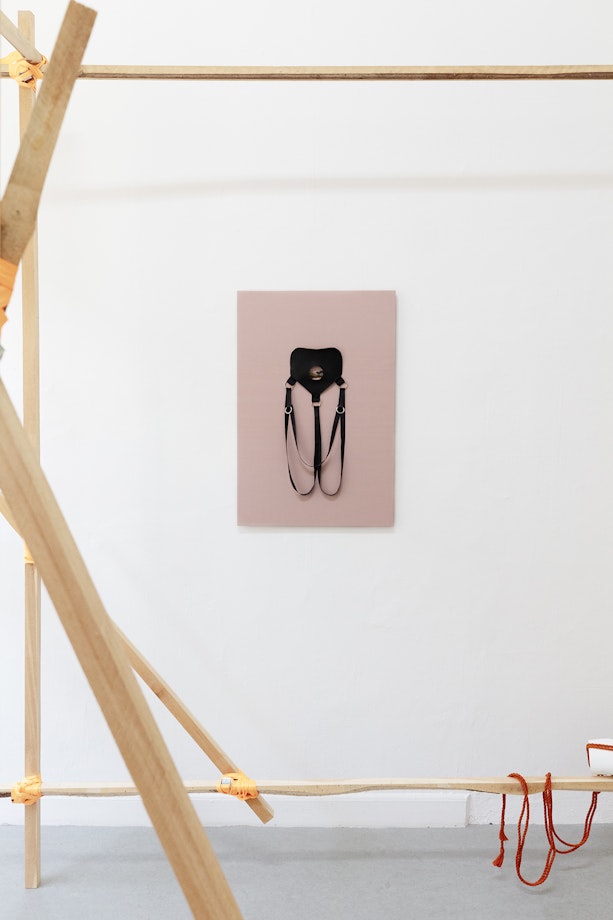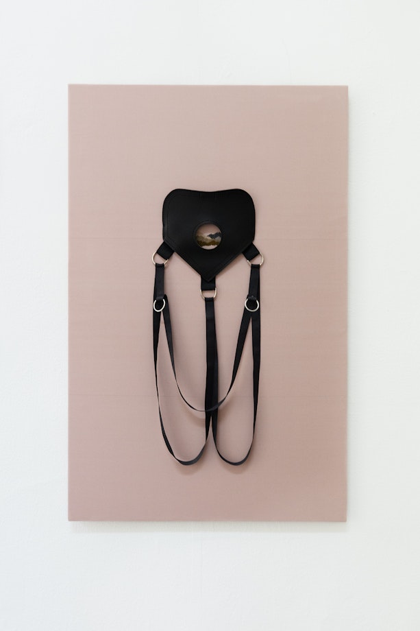 Ett av hennes verk heter Leather Landscape. Vid första anblick tänkte jag ”ryggsäck” och nästan samtidigt ”knullgunga”. Fel bägge två; det är en sele som har mer med sexshop än dragdjur att göra. Och bäraren blir ett landskap inför en kropp som vill fetischera och dominera det – av sinnlig kärlek.