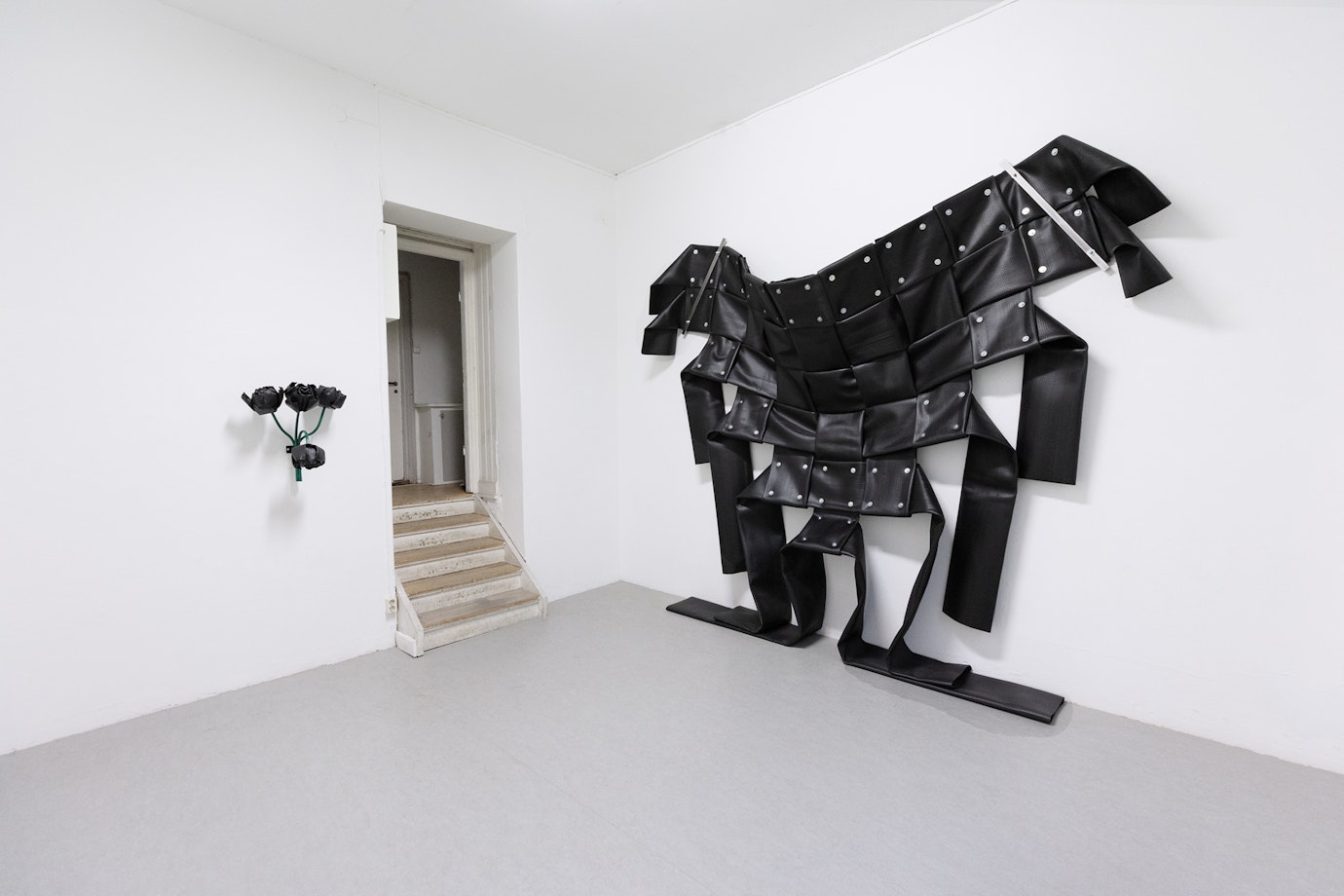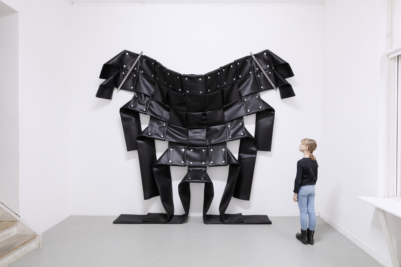 Denna analogi fångar däremot inte upplevelsen av att som betraktare pressas ned i skorna framför Nordmarks mastodontgestalt vars fastnitade slangremsor liknar tentakler. Genom att sätta materialets uttryck i centrum blir makten kännbar, samtidigt som verket avstår från att inta en moraliserande hållning. Genom detta vidareutvecklas Morris kritik av konstens stereotypa impuls att ”gå änglarnas väg”, där den strävar mot det upphöjda och metafysiska. Nordmarks verk omvandlar i stället utställningsrummet till en bur där vi kan tillfredsställa vårt estetiska behov och bortom-mänskliga begär. Det är sorgligt, förstås, men också lite kinky.