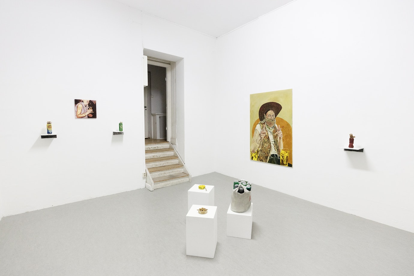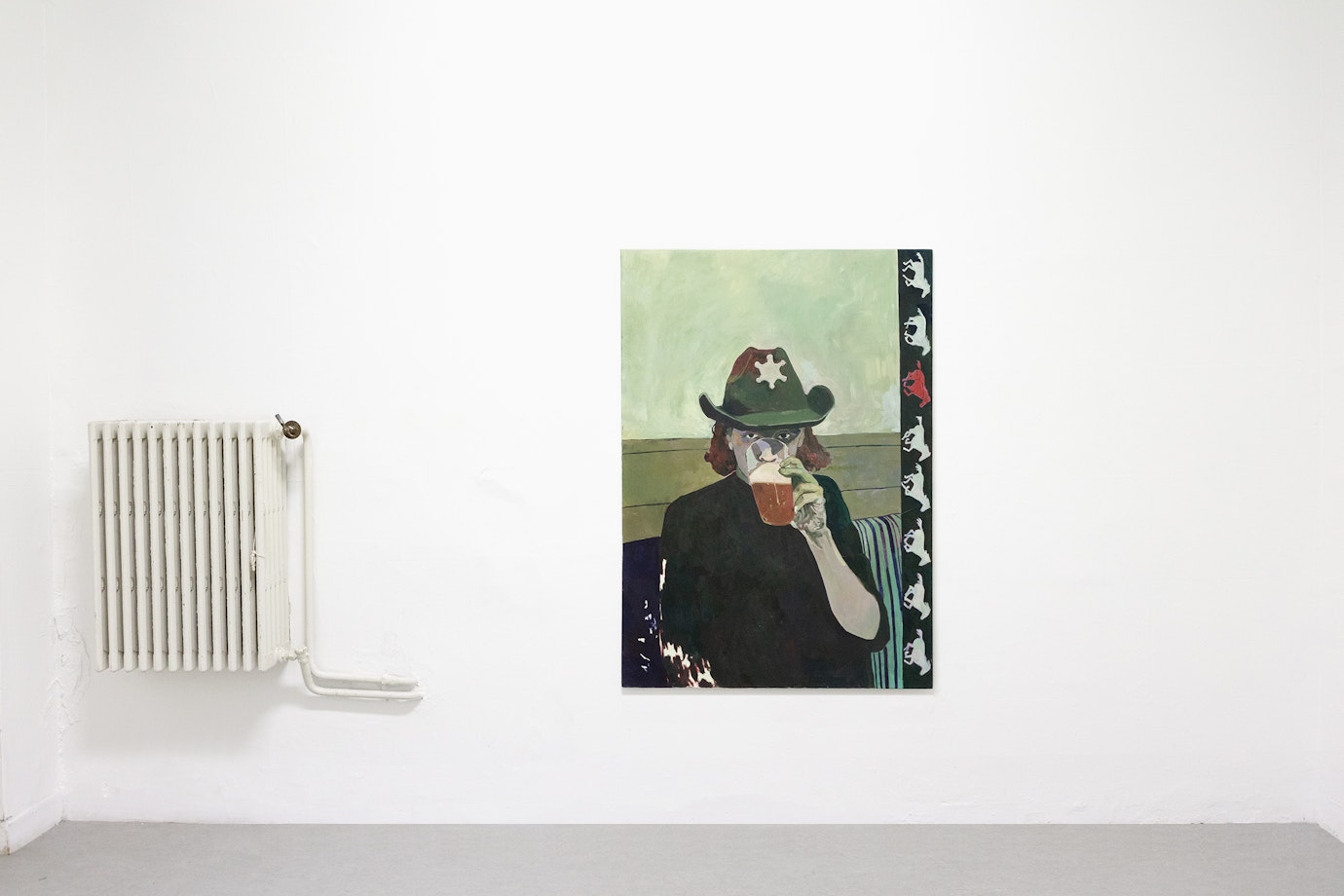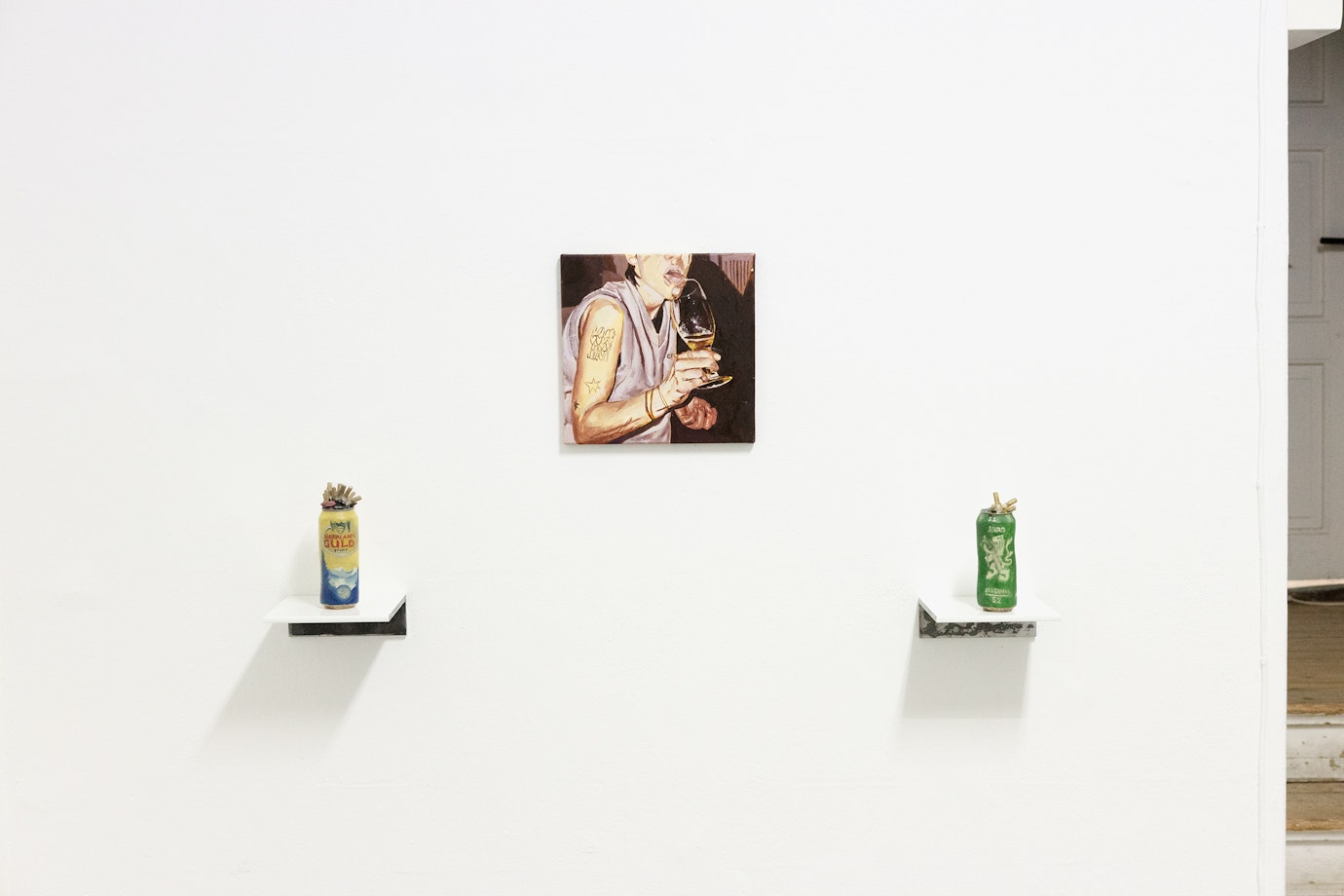 Den där blicken för livskänslan i obetydliga ögonblick, blicken för livets genorisitet mitt i ledan, verkar acceptera det ens omdöme pekar ut som futtigt eller löjligt (cowboyhattarna) som glädjekälla eftersom det vittnar om den där obändiga vitaliteten. Om jag redan har kallat den blicken fin och rörande, blir den vidunderlig när man ser att verken magnifierar den. Och det sker här genom omsorgen i materialval och utförande. Hon med tungan i glaset träder likt anden i flaskan fram, fast ur ett omslutande mörker som även finns under den ärmlösa tröjan. Befriad – Spotta i glaset heter den dessutom – i en värld som på rättvist sätt syns endast i målningen: den där genomskinligheten har glaset bara där, dess fantastiska sätt att fånga ljuset och ögonblicket då tungan ska fram, beskärningen – snapshotet förlängs och förstärks som måleri när detta lägger till känslan av sin egen tillkomstprocessen. Och något liknande känner man inför Ekesiöös målade Norrlandsburk. Den är så realistiskt och accepterande av livsledan, vilken genom handmålandet blir komisk och ifrågasättande.
