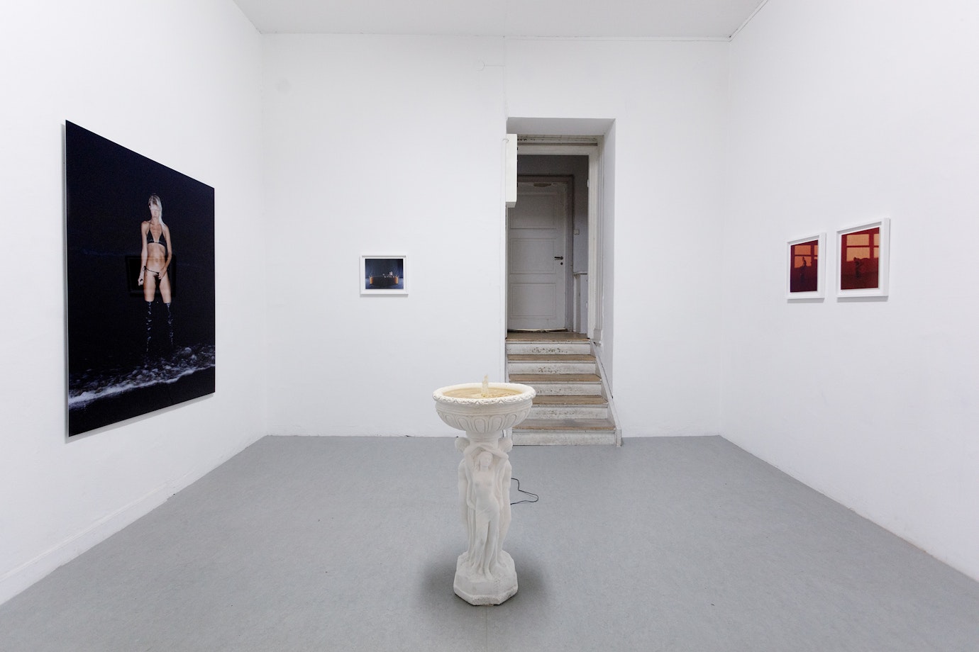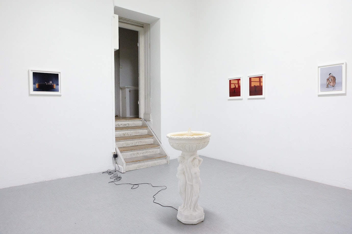 Jessica Ekströms HOLY WATER erbjuder oss hyperverklighet. Vi möts av stiliserade vogueögonblick, perfekta färgkombinationer, men det rinner kiss. Vi tillreds inträde i ett personligt helvete eller himmelrike, oklart, men vi får titta in och en änglalik gestalt spänner sin strålande, ursäkta ordvitsen, sin strålande blick i oss. Och så är det något med den där självutlösaren. En sladd går från subjektets hand rakt in i betraktarens öga. Vi förnekas vår funktion. Vi har ingen roll i bilderna och ändå är vi ständigt tilltalade, satta på plats. Vem är egentligen påkommen här inne?