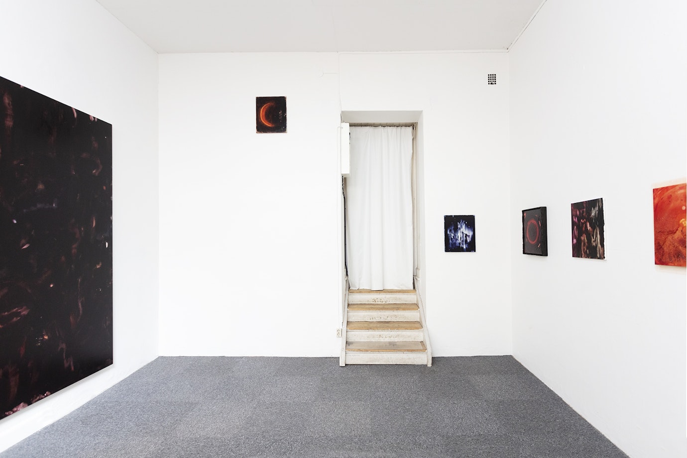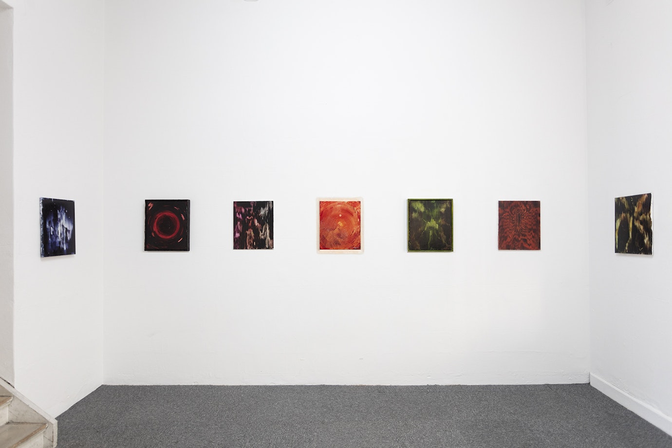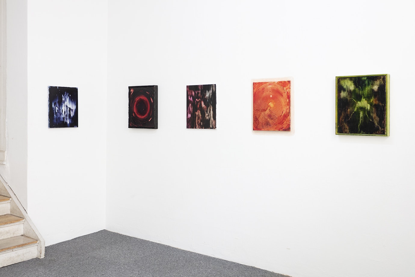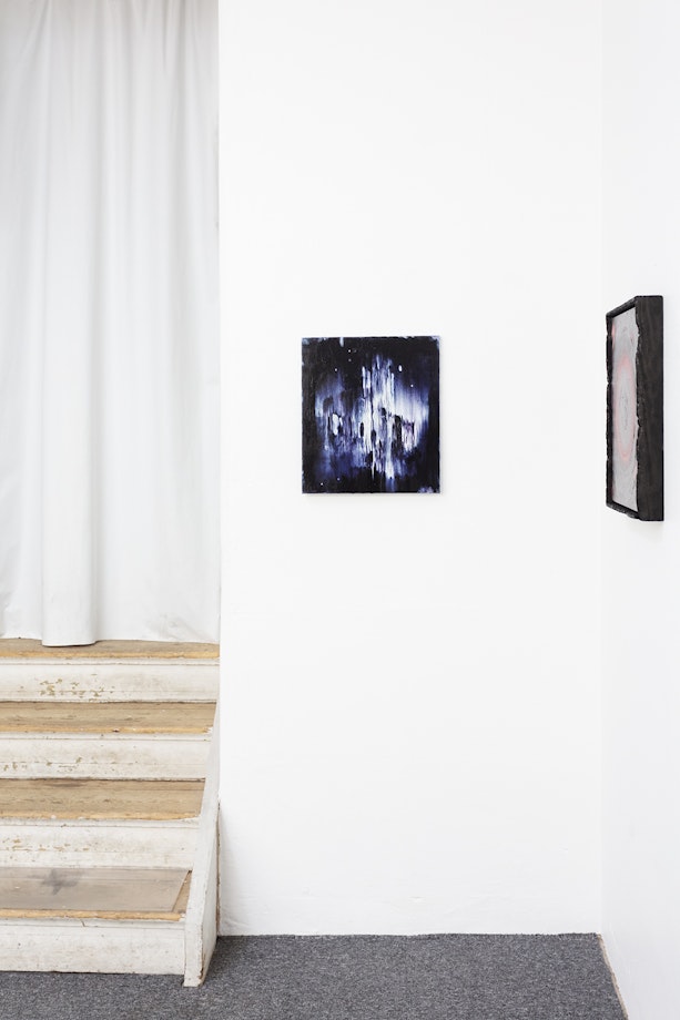 Handen smeker genom färgen och formar bilden, slemmet fortsätter växa ut på ramen, månen jäser långsamt, masken ringlar sig fram i månskenet. Små koncentrerade ögonblick där färgens taktilitet och konsistens transformeras till bild. Ett magiskt ögonblick. Ett omslutande rum att träda in i, att hänge sig med hela sin kropp. Obehagligt och förföriskt. Intensivt och motsägelsefullt självklart. Vad som skrämmer mest, påminner starkast om livet som finns.