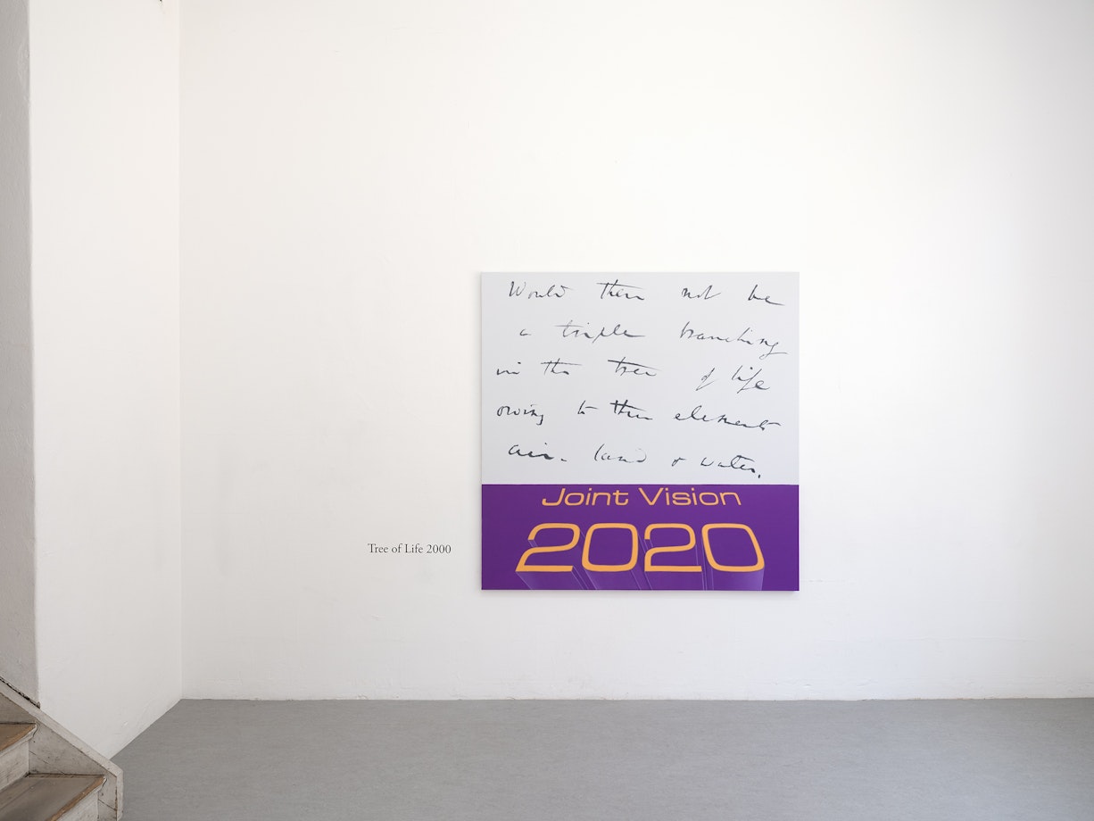 Den ena målningen, med titeln Lebensrune, visar några nedklottrade darriga linjer som bildar formen av en stam som delar sig i tre grenar. Den andra, Tree of Life 2000, har i de övre två tredjedelarna ett likartat uttryck. Handskriven text har avbildats i kraftigt uppförstorat format. Texten kan uttydas som: ”Would there not be a triple branching in the tree of life owing to three elements air, land & water”. Nedanför denna återfinns en logotyp i orange mot violett med orden ”Joint Vision” och årtalet ”2020”, formade i perspektivisk förkortning.
