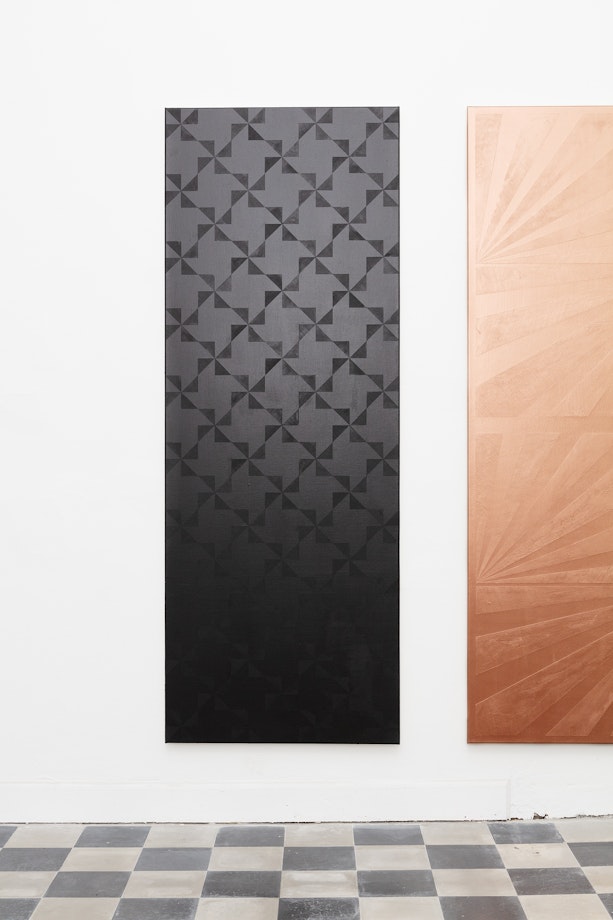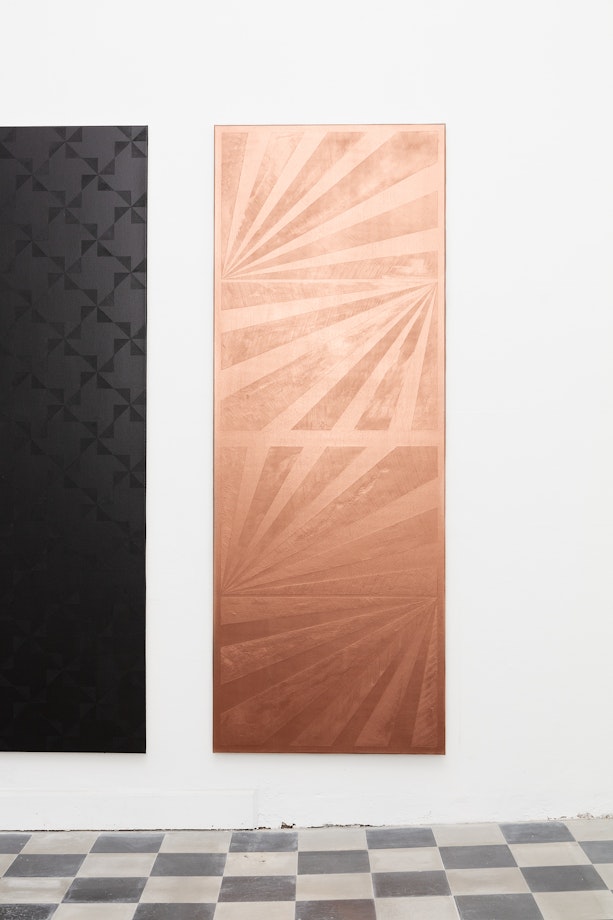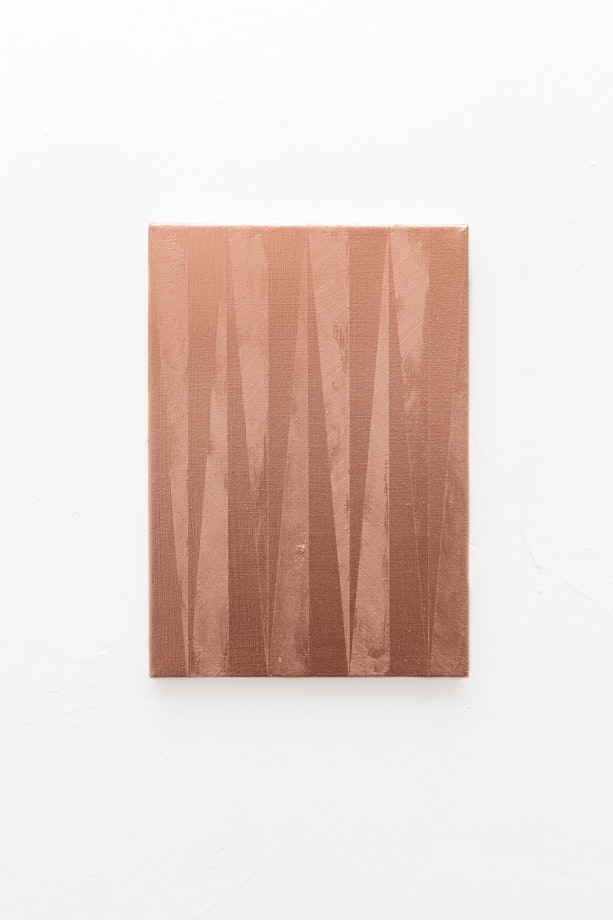 I den kopparfärgade Revive skapar långsmala, kilformade former ett mönster som leker med centralperspektivets linjäritet genom att låta dem strömma ut från målningens ena hörn. Här uppstår också en annan repetition, där en sammanhängande komposition speglas och läggs dikt an mot den första. Slutligen speglas hela denna formation och dubbleras undertill, likt ett spelkort.