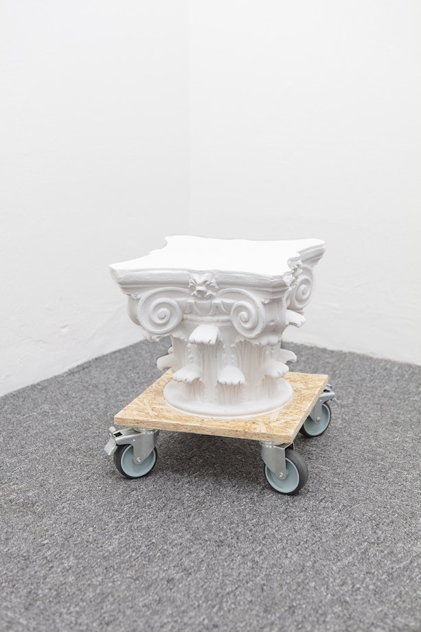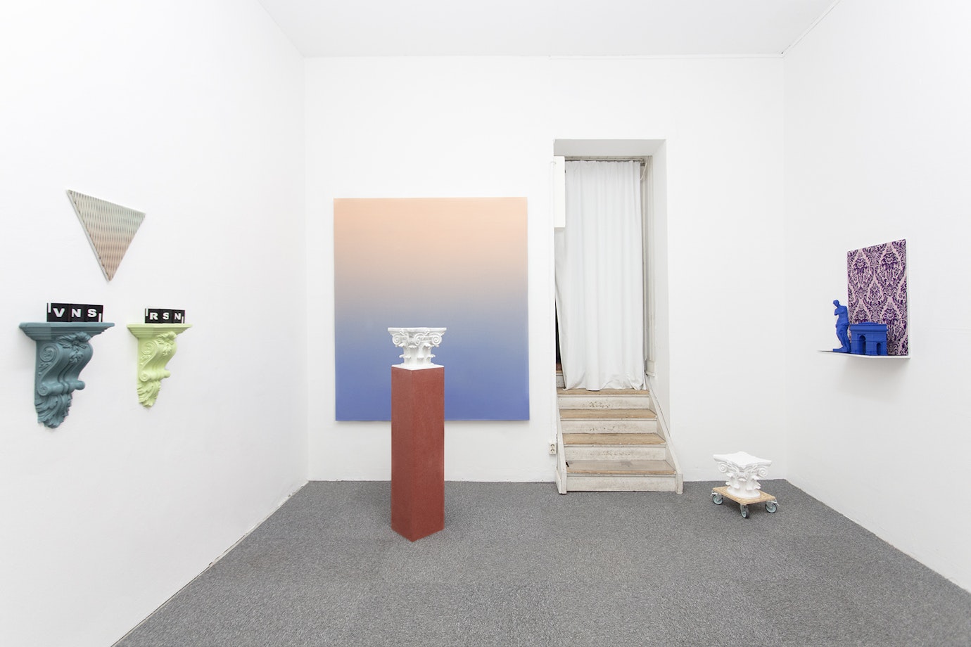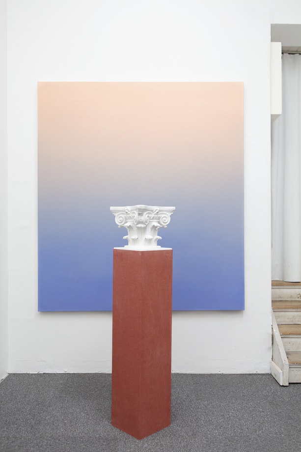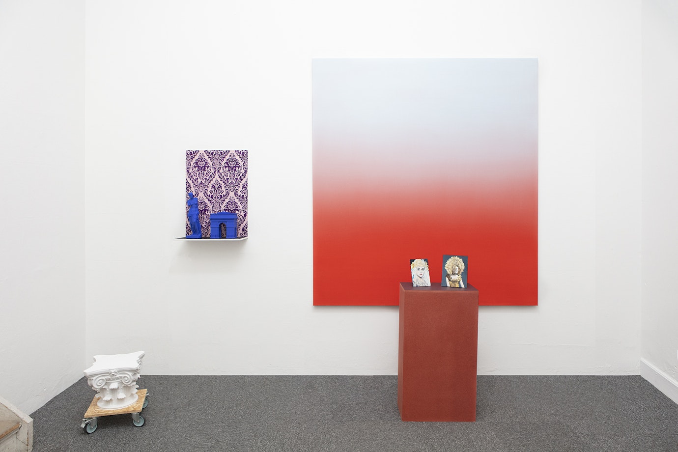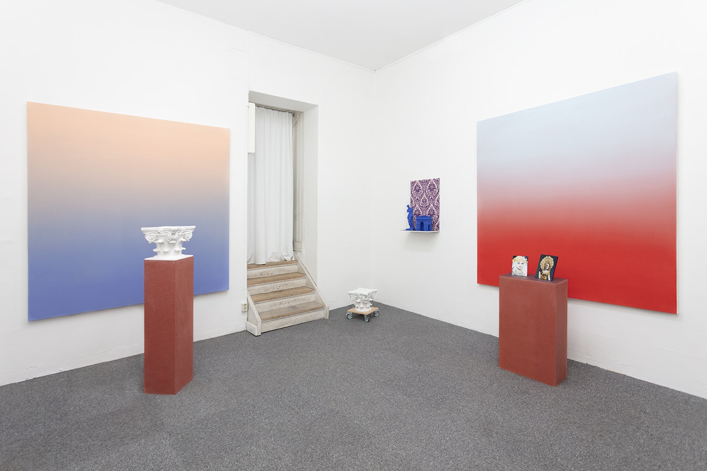 Hela utställningen verkar gå i RGB-färgskala och består av ett par olika element. Ejlerskovs två dukar Dream Gradientser från håll ut som de gjorts med digitaltryck eller airbrush, men på kortare avstånd framträder lager-på-lager av tunn akryl bestruken med närmast soppborstbreda penseldrag. Det går knappt att få en skarp bild av dem med en digitalkamera eftersom den inte hittar skärpedjupet. Jag tycker först att termen ”gradient” är lite missvisande med dess konnotation till pixlar, och tänker på Enno Hallek som istället talar om sin ”glissando-färgskala” – vilket beskriver en musikalisk glidning av mellantoner. Samtidigt är Ejlerskovs målning rätt tyst. Kanske är ambivalensen rentav poängen med den digitalrefererande titeln. Ena duken funkar som en slags backdrop till Furåkers Static Plinth. Skulpturen ser ut som ett hellenistiskt pelarhuvud på en tegelröd piedestal. När jag försöker förstå om den är korintisk eller jonisk visar den sig vara en sammansättning av olika stuckaturer. Och där finns ett annat pelarhuvud, Merucrial Plinth, denna gång placerad på en hjulförsedd trävagn. Jag noterar att Furåkers titlar hänvisar till piedestalerna, och undrar om de ska de förstås som scenografi.