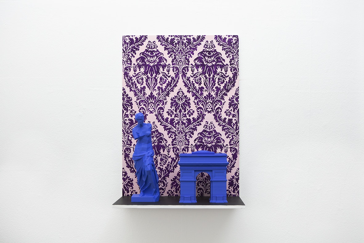 Slutligen, en stående, L-formad uppställning av Furåker som bär titeln Venus’s Triomphe. Det är en monter-liknande, eller altarlik, installation där ryggtavlan av medaljongtapetmönster har målats i violett oljefärg, och på det utskjutande hyllplanet han ställt upp två mättade akrylblå 3D printade skulpturer. Den ena är en sån där Venus de Milo statyett som brukar finnas i inredningsmagasin och restauranger med dagens rätt eller valfri ordinarie-pizza 95 kronor. Fast kantigare. Den andra som ser ut som en skalmodell av triumfbågen i Paris. Eller eldstaden i stuck-lägenheten.