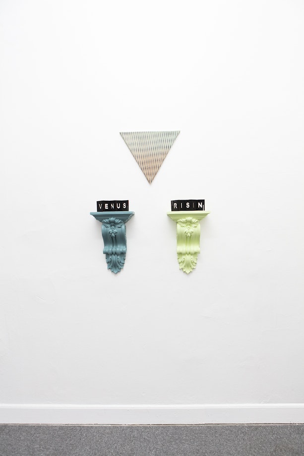 Verket som ger utställningen sin titel är ett gemensamt verk av Ejlerskov och Furåker. Två hyllor som för tankarna till ett borgligt stuckaturbesatt hem från slutet av 1800-talet. Ovanför de två pastellfärgade stuck-hyllorna står, eller svävar, utskurna träbokstäver som bildar orden VENUS RISING och över dem hänger en triangulär målning med en liknande tonskala som de större målningarna. Ytterligare en tegelröd piedestal av Furåker har fått titeln Sun and Moon Plinth. På den står två små, virtuost oljemålade porträtt som hämtats ur modemagasin.