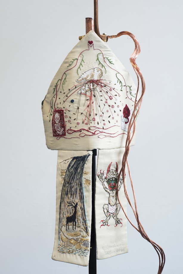 Han började då brodera himlarosen som hade uppenbarat sig för honom på påvehattens framsida och fortsatte sedan sin snirkliga sömsvandring med motiv inspirerade av konstnärer och personer som Torsten Andersson, Hilma af Klint, Cecilia Edefalk, Björnjägarn, Hieronymus Bosch, Edvard Munch, Carl Fredrik Hill, mfl. Inbroderat i mössan finns också en historia om en självupplevd mirakel kring när Christer var 16 år gammal, höll han på att drunkna i en mosse. Det sista han minns innan allt blev svart, är att hans lungor började fyllas med vatten och jord och att solen sken genom det kolsvarta vattnet. Efter en ljusresa ut ur mörkret, vaknade han plötsligt upp på samma sten som han tidigare hade hoppat ner i mossen ifrån. För Christer är det oklart hur han kom upp på stenen igen. Kanske hade han aldrig varit ner i träsket. Mysterier mår bäst av att förbli olösta, för vem vill egentligen veta hur allting egentligen hänger ihop? Gud måste ha väldigt tråkigt, där uppe, om han nu finns.
