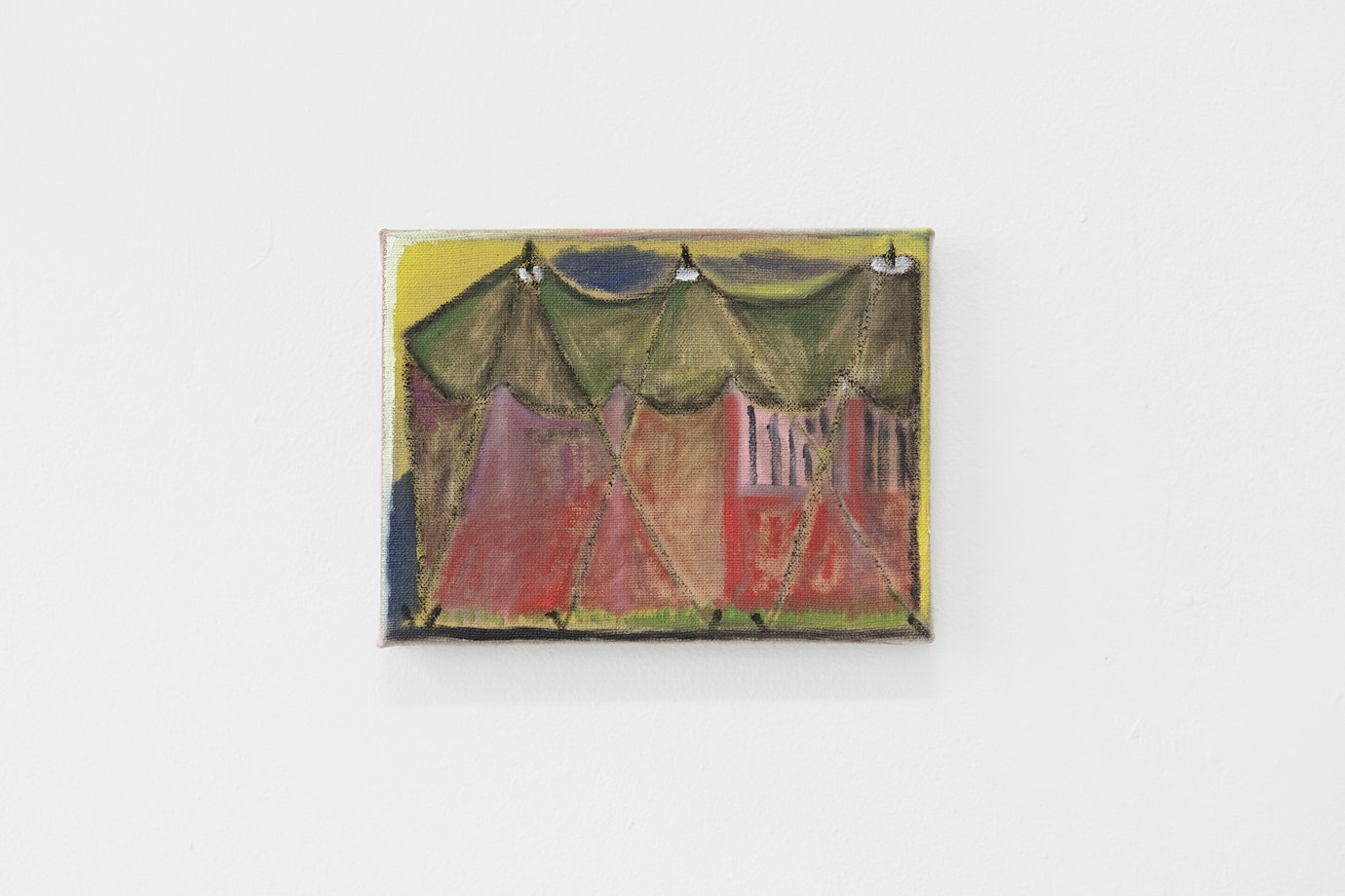 När jag ser Lisa Lundgrens ”En annan dag” tänker jag på kontrasten mellan de färgade tälten och de som målats över och slocknat. Jag ser att dessa former tillsammans bildas ett kollektiv vars intryck lämnar mig med en känsla som vårt språk inte tycks ha något bra ord för. Det kanske inte är vackert, men fuck it: sånt är livet.
